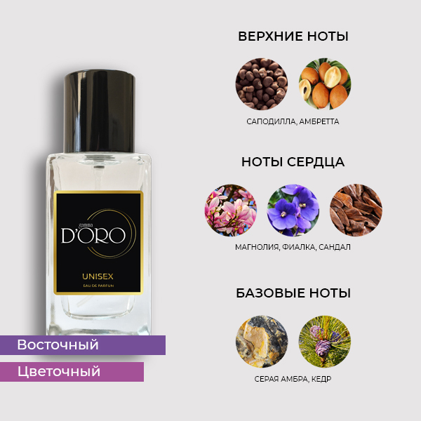 Верхние ноты аромата раскрываются легкими и сладковатыми аккордами амбретты и саподиллы, которые создают свежий и ненавязчивый фон. В сердце парфюма доминируют цветочные аккорды магнолии и сандала, добавляющие глубину и утонченность композиции. Базовые ноты мускуса, амбры и кедра придают аромату теплоту и стойкость, завершая его мягким и длительным шлейфом. Универсальный парфюм с утонченным характером предназначен и для повседневного использования, и особых случаев.