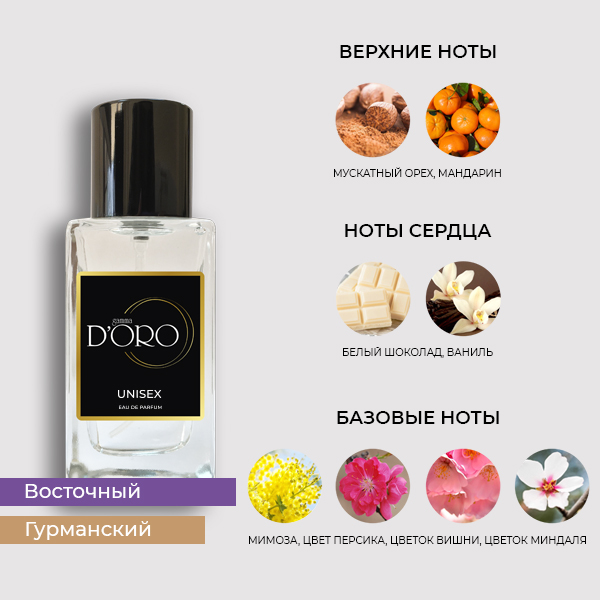 мускатный орех, белый шоколад, мандарин, ваниль, мимоза, цвет персика, цветок вишни, цветок миндаля