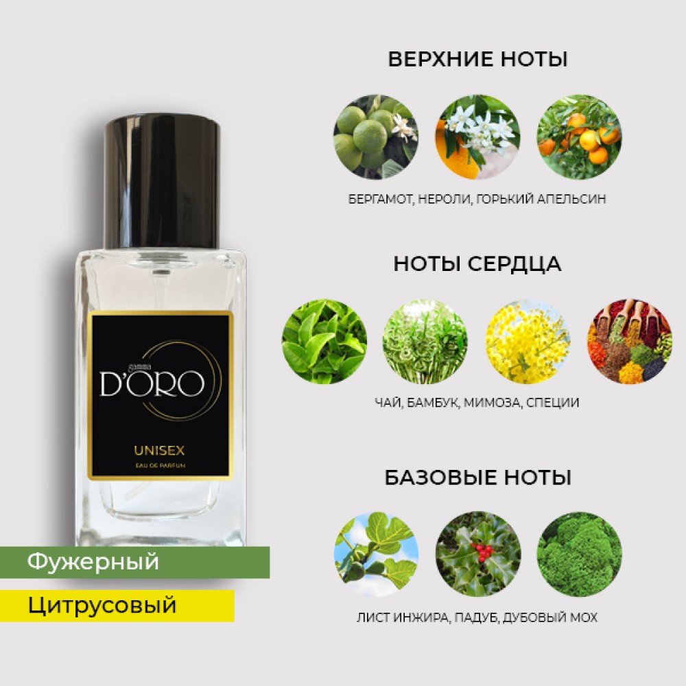 бергамот, нероли, горький апельсин, чай, бамбук, мимоза, специи, лист инжира, падуб, дубовый мох