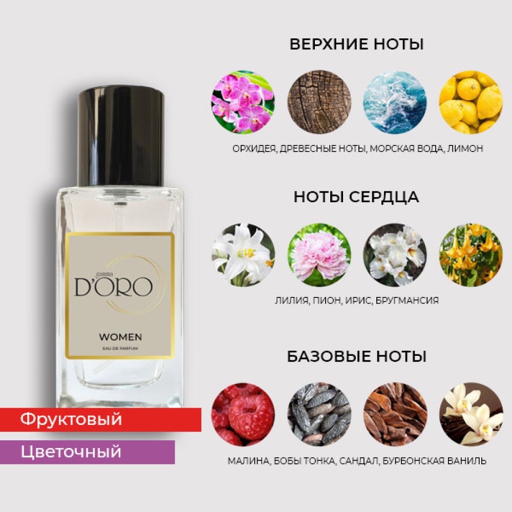 Верхние ноты: Орхидея, яблоко, темные древесные ноты, морская вода, жасмин, лимон